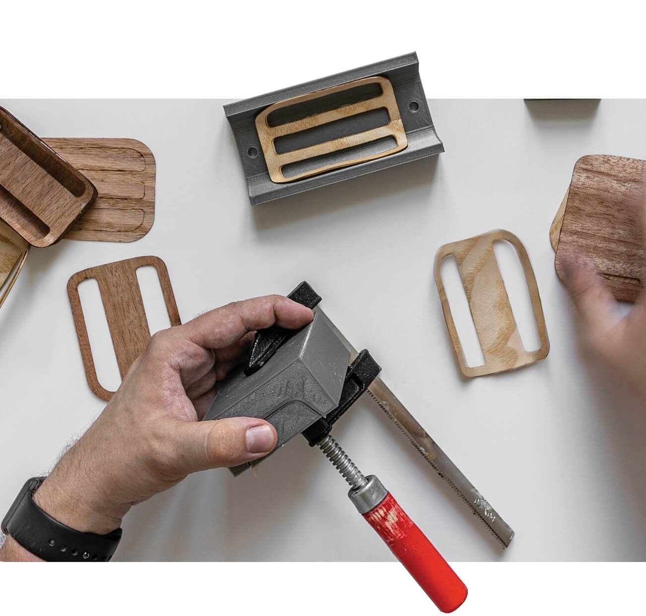 Another method, equally useful and a bit more elegant is to create a 3D printed mould and recreate the mockups using veneers. This method makes it easier to define manufacturing properties and make cor rections in the CAD model.