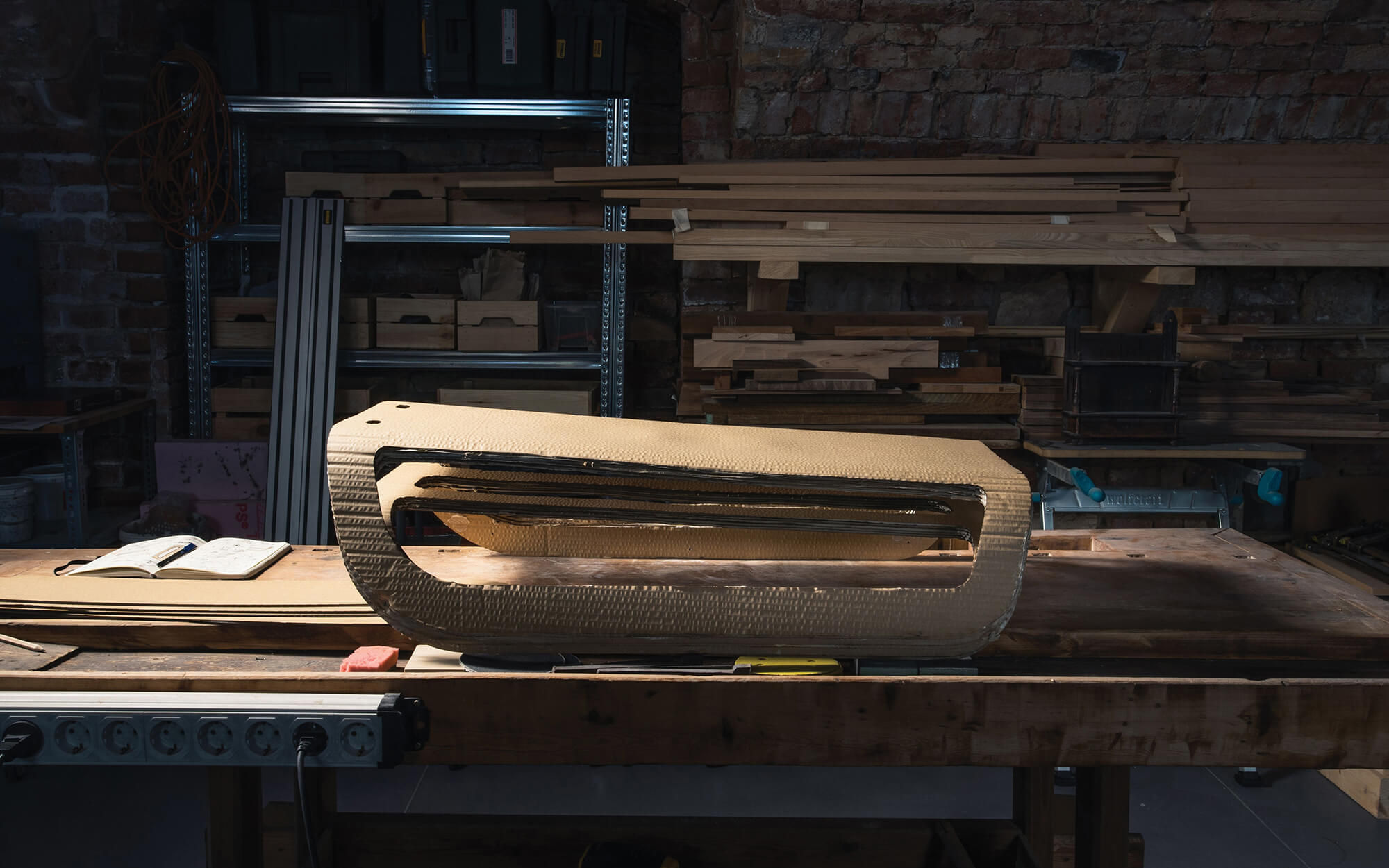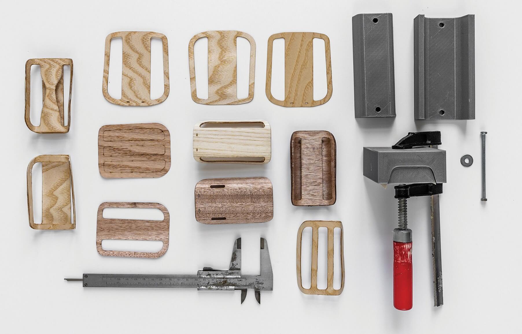 I laser-cut the outline of the sled onto veneer sheets and bent them into shape using a 3D printed jig. Due to the scale of the mockup I only used 2-3 layers of veneer for each element. The process was repeated with several types of veneer, which also helped me validate any lingering CMF questions.